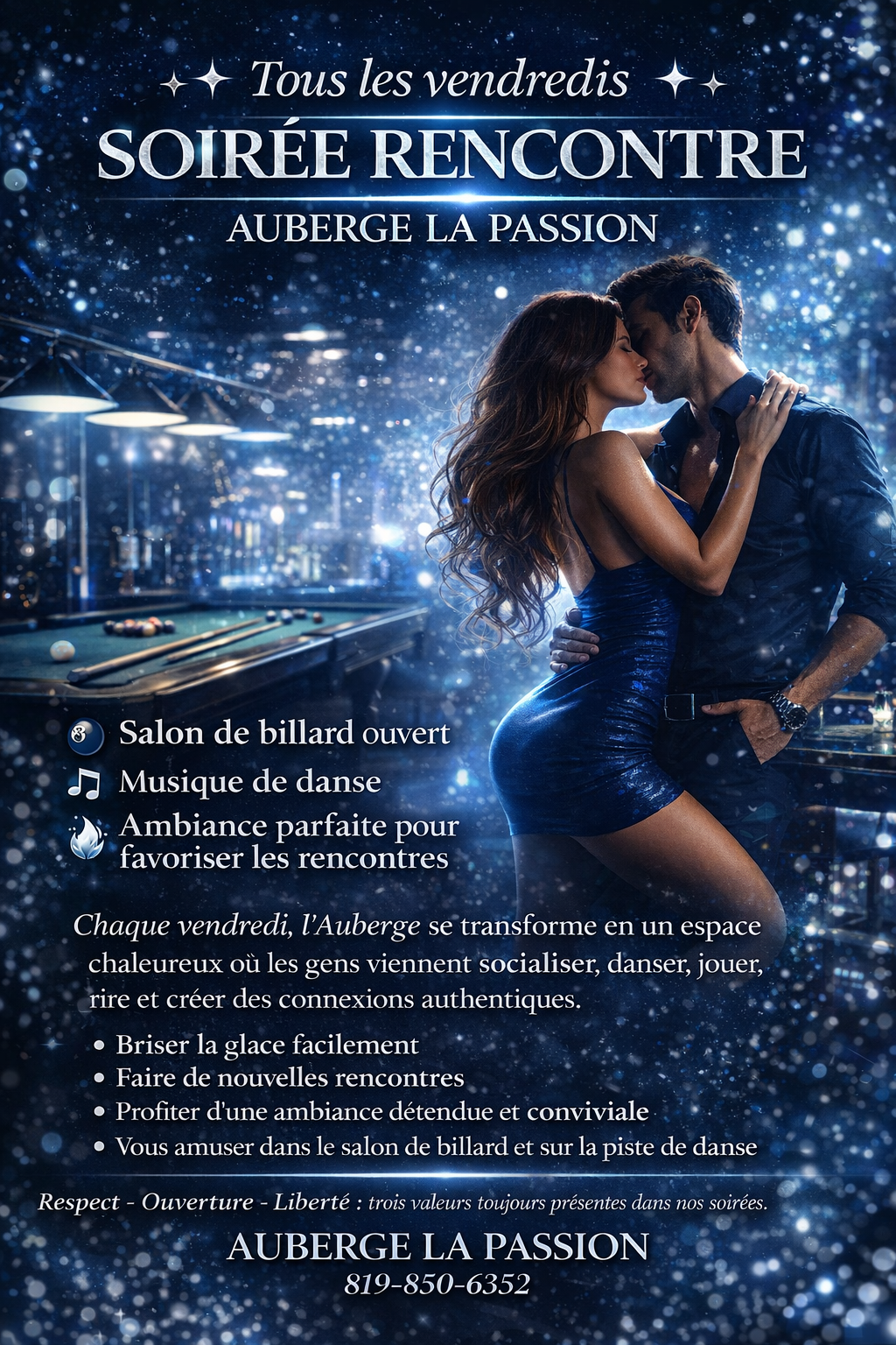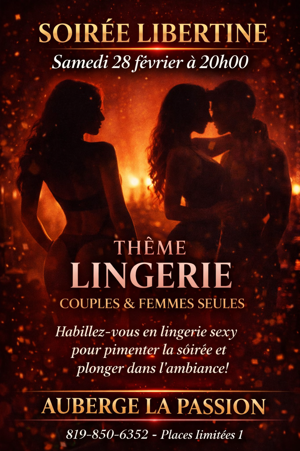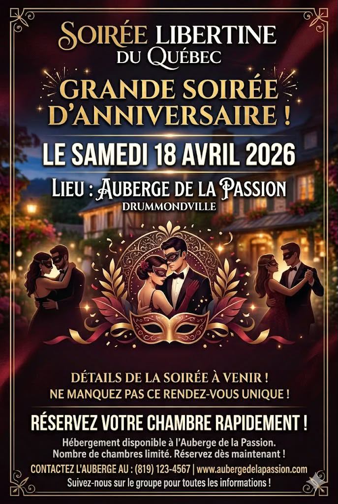 L’endroit où il est possible de réaliser chacun de vos fantasmes dans le respect de tous. Nos soirées sont organisées afin que vous puissiez faire la connaissance de couples libertins provenant de différents endroits du Québec. Cela vous permet enfin de laisser le virtuel de côté pour valider réellement la chimie présente entre les couples, faire une première connaissance, parler et peut-être bien allumer quelques petits feux…qui sait?